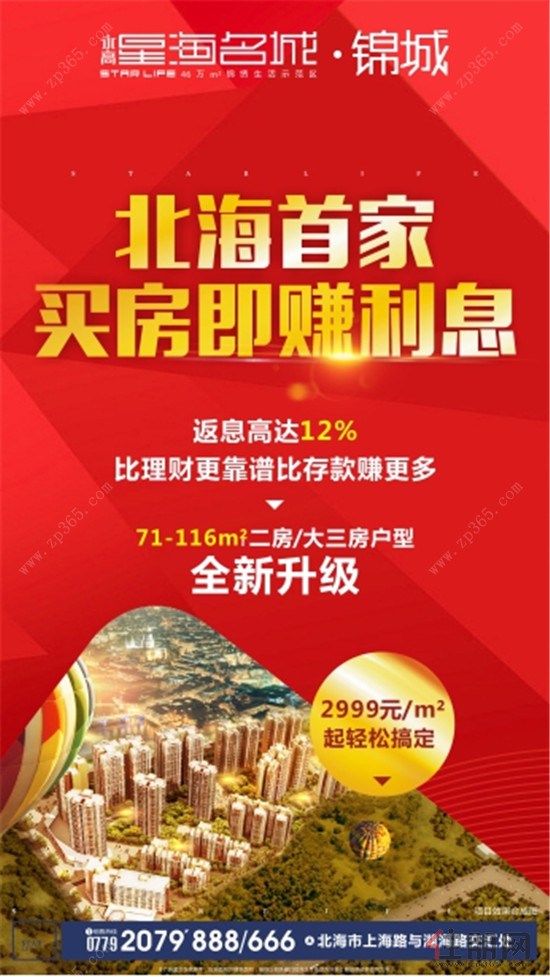 星海名城·锦城,46万㎡生活示范区,北海人居新标杆,引领北海幸福生活!76-116㎡二房/大三房户型全面升级,现在预约1000抵10000元。新品上市,2999元/㎡起抢幸福大三房,数量有限,要快!快!快!0首付购房还享返高额利息,比理财更靠谱,比存款更赚钱。